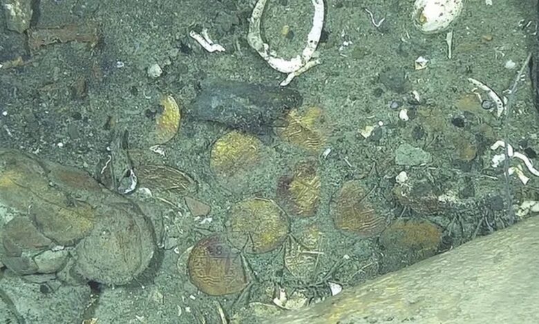 На фотографиях зафиксировали десятки необработанных монет, разбросанных около затонувшего судна на глубине примерно 600 м.