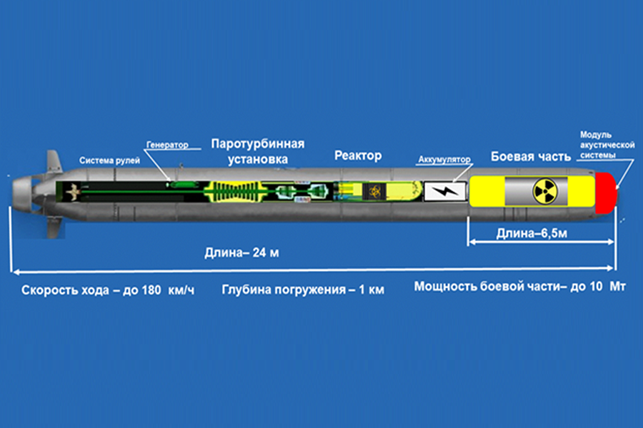 Данное оружие обладает ядерной силовой установкой, позволяющей преодолевать огромные расстояния, маневрировать и находиться в режиме ожидания неограниченное время, отметил специалист.