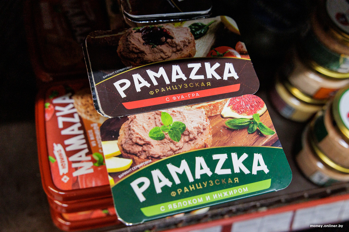 Чуть дальше встречаем еще один хит — мясную намазку. На полке две марки, на этикетке одной из них написано, что продукт произведен по заказу российской фирмы БМК в Столбцовском районе — речь идет о продукте «Pamazka французская».
