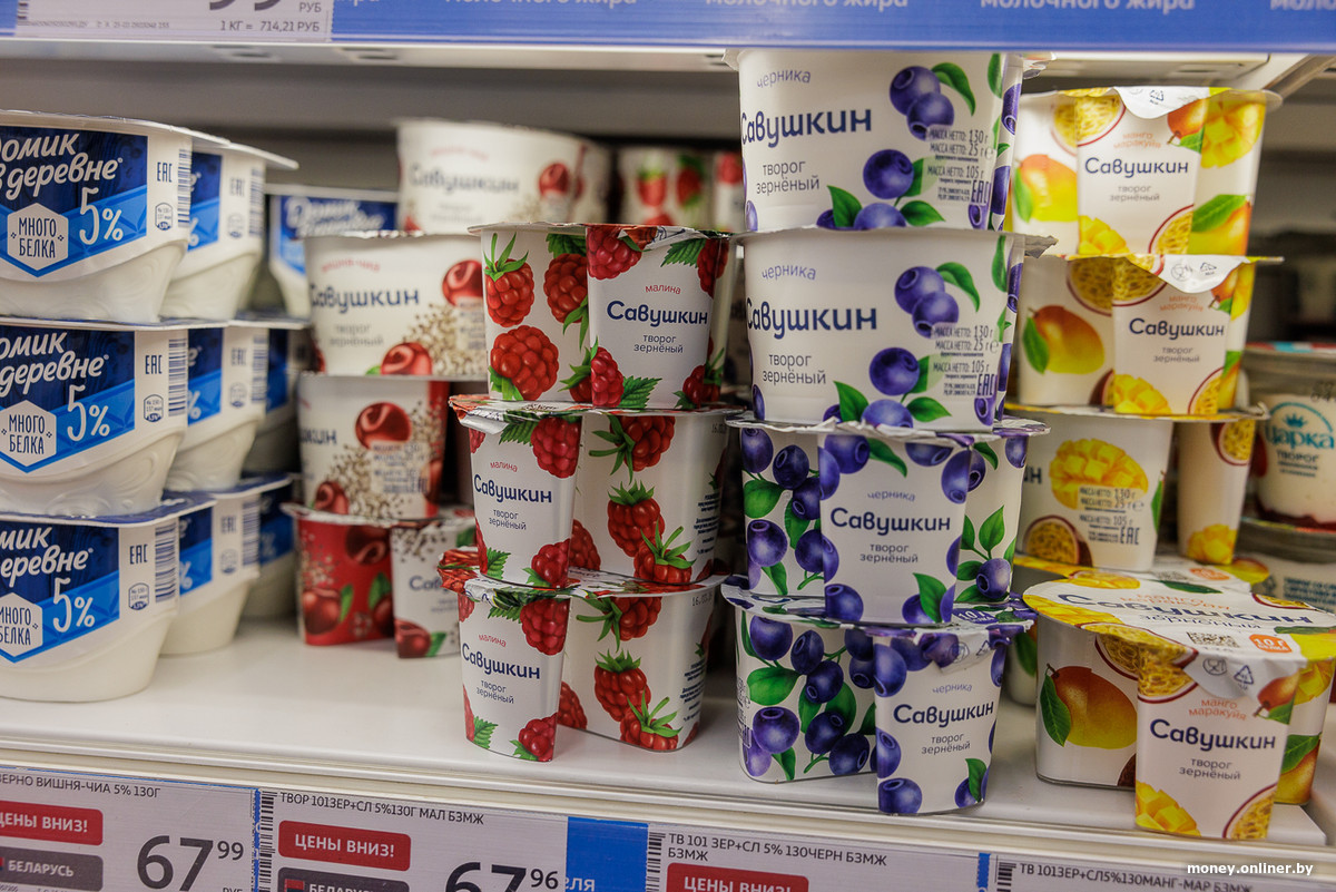 Зерненый «Савушкин» тоже есть в продаже, коробочку можно унести домой за почти 68 российских рублей, или 2,48 белорусского. В Минске на это хватит 1,56 рубля. Кстати, если присмотреться к ценникам, можно увидеть акцент на названии страны-производителя.
