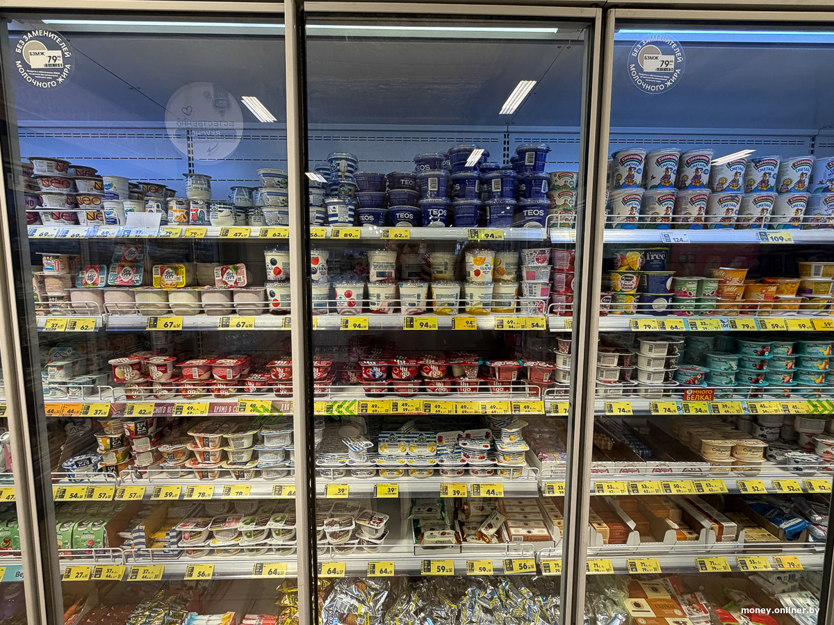 Знакомые синие банки замечаем в отделе молочных продуктов: классический йогурт Teos продают по 62,99 российского рубля за 140-граммовую упаковку. В переводе на белорусские это почти 2,30 рубля, а в Минске его можно купить чуть более чем за 1,5.