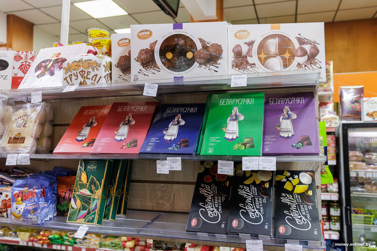 Идем изучать полки дальше: печенье «Слодыч», пастила «Красный мозырянин», драже «Красный пищевик», конфеты «Белорусочка», которые, по словам продавцов, на 8 Марта уходили на ура. Замечаем зефир-одуванчик и зефирные грибы, трюфели.