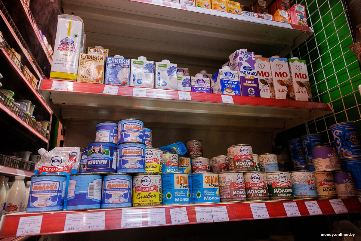 — Колбасы от минского завода, кобринские сыры, гродненские колбасы, например «Минская». Тушенку берем, соленья, «Горынь», — вспоминает собеседница марку консервов. — Вот кефир девушка пьет (кивает в сторону другой продавщицы, которая как раз в перерыве держит в руках бутылку с кефиром).