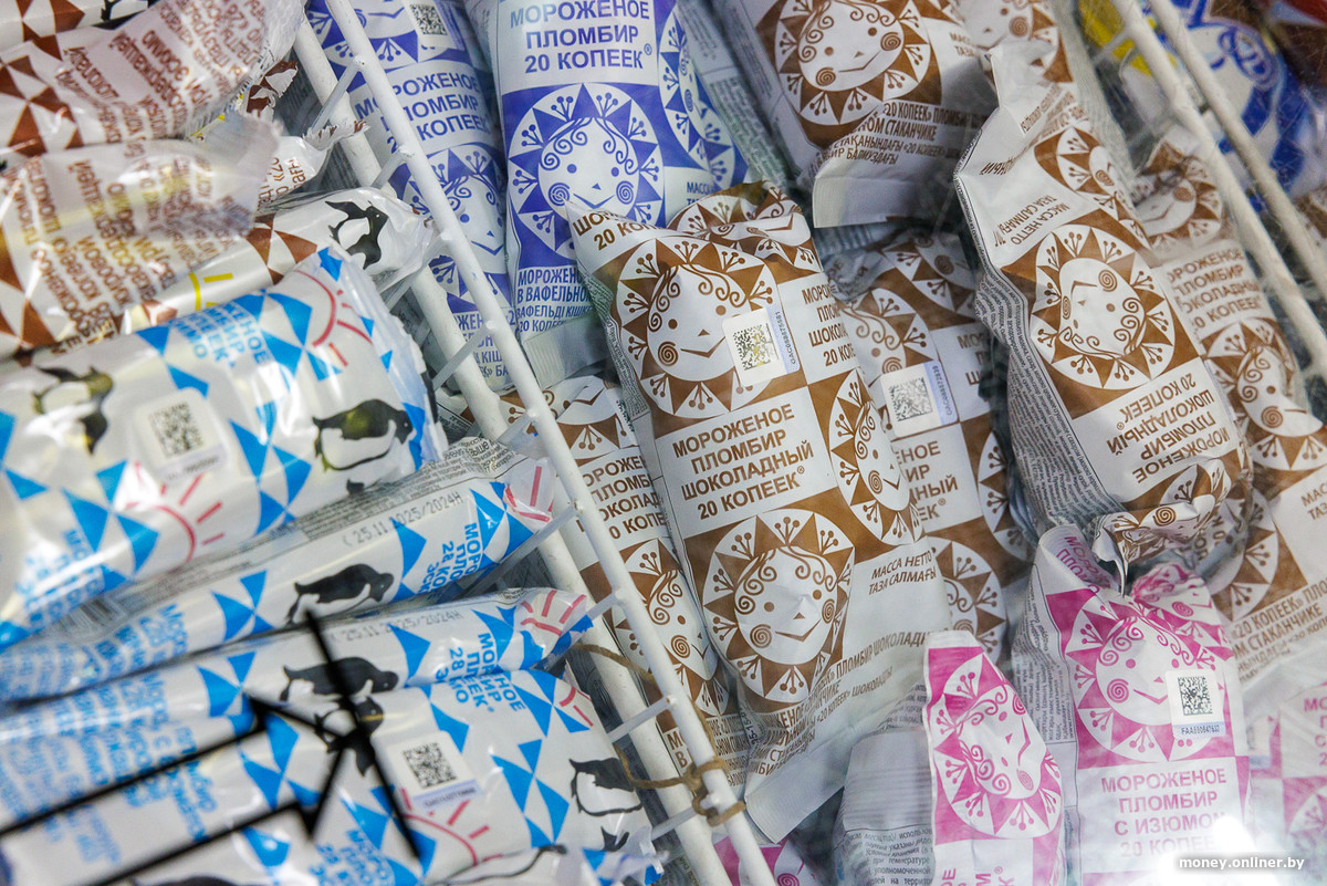 В подтверждение этих слов за время нашего разговора в магазине появляется покупатель, который почти доверху наполняет корзину мороженым. Сам мужчина фотографироваться не захотел, но разрешил нам снять свою без пяти минут покупку. Мы тем временем заглядываем на упаковки в морозилке: есть мороженое из Кобрина и от Минского хладокомбината №2.